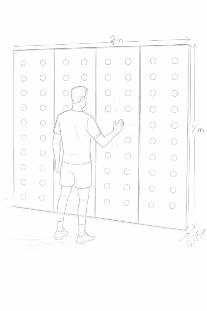 Das vorgeschlagene Therapiesystem setzt auf einen kontaktlosen, interaktiven Ansatz. Konkret soll der Patient durch audiovisuelle Reize zu Bewegungen motiviert werden, ohne dass ein Therapeut ihn manuell führen oder berühren muss. Technisch ließe sich dies z.B. durch eine sensorgestützte Trainingswand mit Lichtsignalen umsetzen: Auf der Fläche der Wand leuchten in bestimmten Mustern Punkte oder Symbole auf, die der Patient mit den Händen oder Füßen erreichen soll. Solche Lichtimpulse geben räumliche Bewegungsabläufe vor, denen der Patient aktiv folgen muss. Gleichzeitig erfassen Sensoren die Reaktionen und Bewegungen des Patienten, um Feedback zu geben und den Trainingsfortschritt zu überwachen (etwa über eine verbundene App-Steuerung). Dieses Konzept ermöglicht es dem Patienten, selbstständig Bewegungen auszuführen und zu üben – der Therapeut kann dabei aus der Distanz Anweisungen geben oder Programme einstellen, muss aber körperlich kaum eingreifen.