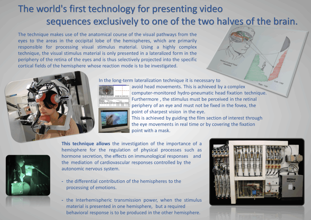 Das am Zentrum für Neuropsychologische Forschung entwickelte Verfahren ist eine komplette Neuentwicklung, aufbauend auf einem von Wittling (1984) entwickelten Verfahren, das in der Vergangenheit in zahlreichen Hirnasymmetrie-Untersuchungen Anwendung fand. Dieses bislang weltweit einzigartige Verfahren basiert auf dem anatomischen Verlauf der Sehbahn. Durch die spezielle Versuchstechnik wird visuelles Reizmaterial (Filme, Gedächtnismaterialien, komplexe kognitive Aufgabenstellungen usw.) jeweils ausschließlich in eine ganz bestimmte Hälfte der Netzhaut projiziert, und zwar unabhängig von vorkommenden Augenbewegungen. Auf diese Weise gelangt das Reizmaterial selektiv nur in die visuellen Rindenfelder der Hemisphäre, deren Reaktionsweise untersucht werden soll. Mit Hilfe dieser Versuchstechnik war es erstmals möglich geworden, die unterschiedliche Rolle der beiden Hirnseiten für die Regulation autonom-nervöser Körperprozesse zu untersuchen, wie z. B. Blutdruckregulation, Hormonausschüttung, Schlagvolumen, Pumpleistung und Kontraktionskraft des Herzens, sympathisch – parasympathische Balance usw. Unter Anwendungsaspekten eignet sich das Verfahren u. a. zum selektiven Training einer spezifischen Hemisphäre nach unilateralen Hirninfarkten, zum visuellen Kompensationstraining zur Reduzierung von Geischtsfelddefekten und zur Verbesserung von Wahrnehmungsleistungen in der Geischtsfeldperipherie sowie zur Untersuchung und Behandlung von Neglect-Symptomatik. Das zu verarbeitende visuelle Reizmaterial wird auf einem Video- oder Comupterbildschirm dargeboten. Während sich die Versuchsperson das Reizmaterial anschaut, wird ihre Augenbewegung kontinuierlich mit Hilfe einer Infrarot-CCD-Kamera registriert. Um Artefakte bei der Registrierung der Augenbewegung zu verhindern, werden Kopfbewegungen des Probanden mittels eines speziellen Fixierungssystems weitestgehend eliminiert. Mit Hilfe einer Software wird eine elektronische Maske erzeugt und Teilen des Videobildes überlagert. Die Maske wird den horizontalen Augenbewegungen des Probanden angepaßt. Sie bewegt sich in horizontaler Richtung in direkter Übereinstimmung mit der jeweiligen Blickfixierung des Probanden auf dem Bildschirm hin und her und verdeckt immer den vertikalen Meridian sowie eine der beiden Gesichtsfeldhälften. Auf diese Weise können die Informationen, unabhängig von der Art der vorkommenden Augenbewegungen, immer nur in der jeweils vom Versuchsleiter gewünschten Gesichtsfeldhälfte wahrgenommen werden. In einer neuen Variationsform der Technik wird auf die elektronische Maske verzichtet und der in einer Gesichtsfeldhälfte wahrzunehmende Bildausschnitt mit den Augenbewegungen mitgeführt, so dass der Reiz immer an der exakt gleichen Stelle der Netzhaut abgebildet wird (horizontal stabilisiertes Netzhautbild).
